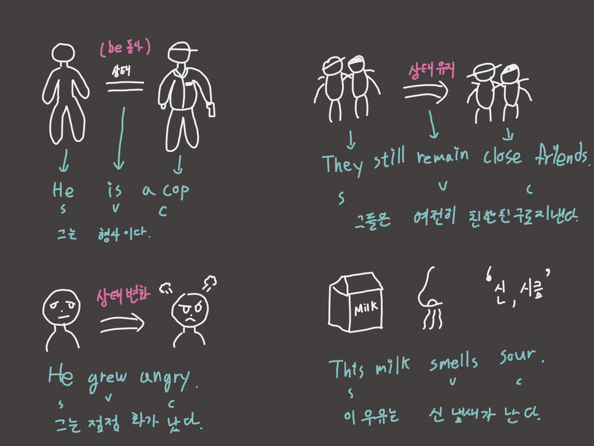 2형식의 공통점은 동사만으로는 완전한 문장이 되지 않고, 목적어가 아닌 주어를 부가적으로 표현해주는 보어가 들어간다는 것입니다.