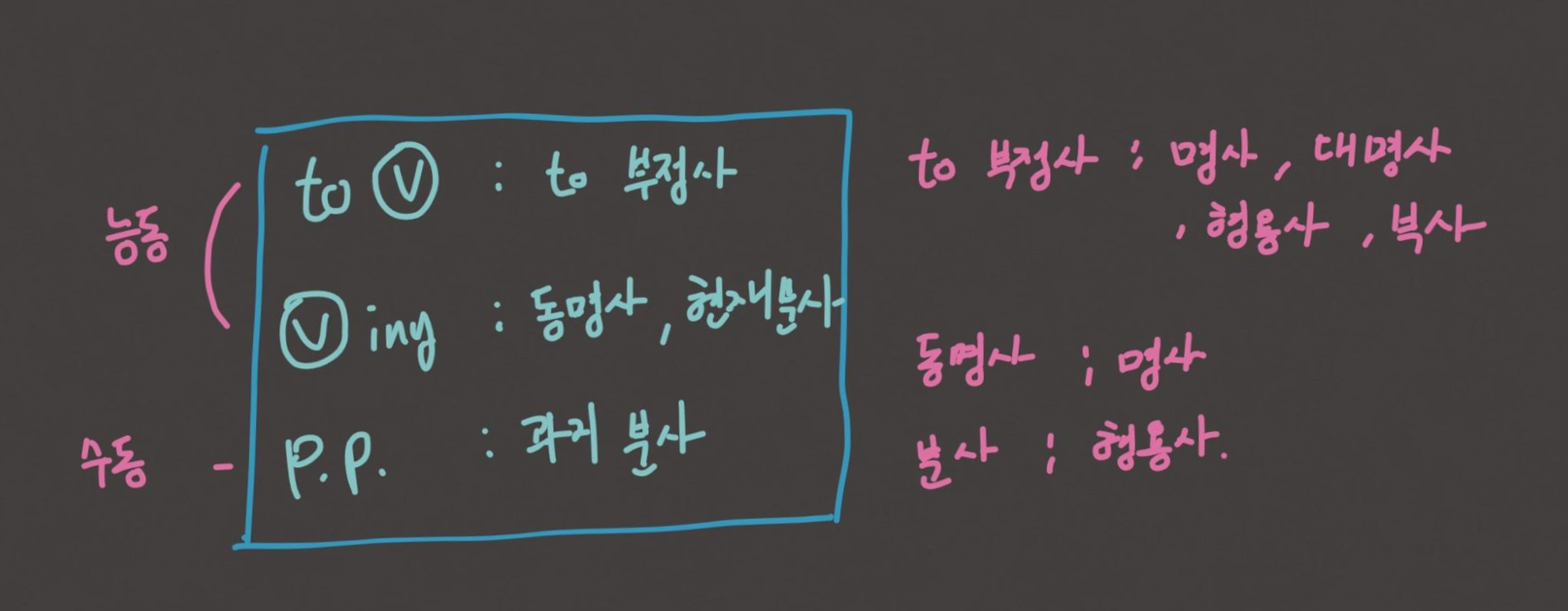 그리고 준동사의 형태는 to 부정사, 동명사, 분사(현재/과거) 이렇게 세가지가 있습니다.