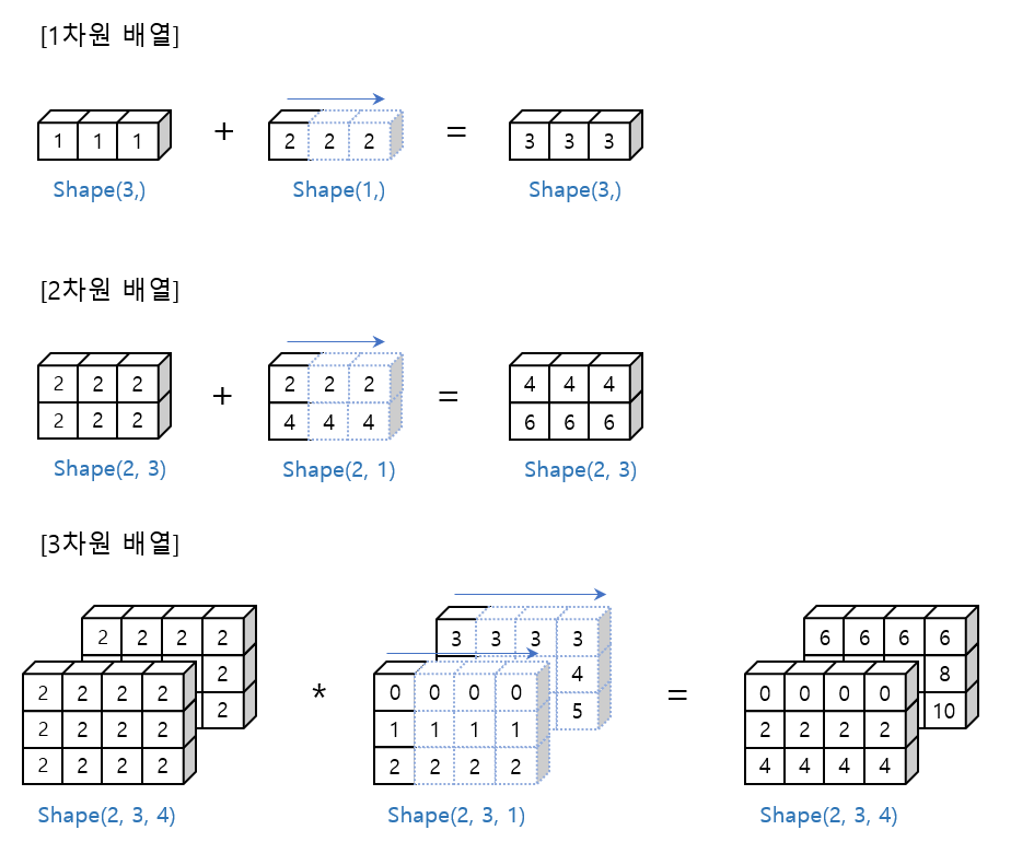 위 예제 코드와 동일한 값을 적용한 그림입니다. 1차원 배열의 크기가 다르더라도 차원이 동일하면 이런 식으로 확장하여 연산합니다.